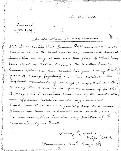 This is to certify that Gunner Robinson.S. No: 112412 has served in the unit under my command since its formation in August 1916 over two years of which have been spent on Active Service on the Western Front. Gunner Robinson has served his gun during two years of heavy fighting and has exhibited the highest standards of courage, energy, and devotion to duty. He is one of the few survivors of the old Battery and I consider him one of the most reliable and efficient soldiers under my command.